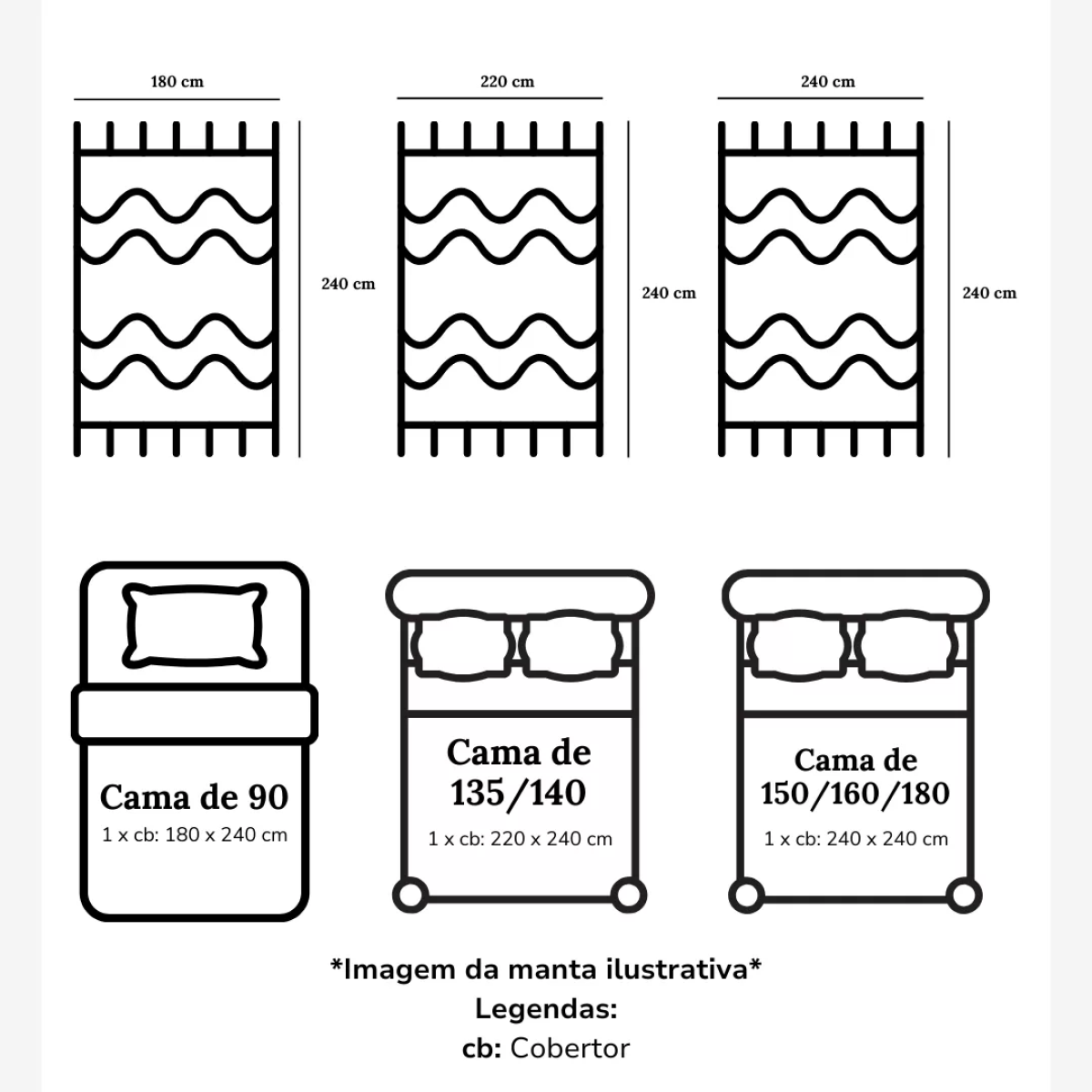 1 - Manta de 220 x 240 cm; - Cama de 150/160 x 200 cm: